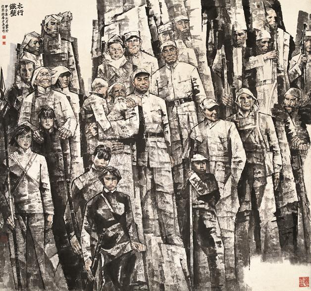 作品简介:《太行铁壁》是画家杨力舟和王迎春夫妇于1984年创作的一幅经典国画,曾荣获第六届全国美术展金奖。这幅作品描绘了朱德、彭德怀、邓小平等领袖人物和民众、战士肩并肩,表现了军民团结、同仇敌忾的爱国主义精神。画作运用北宋山水画的大小斧劈皴法,以侧锋方硬之笔勾线,以山水画的皴法涂出山石的纹理和阴阳向背,造型方面,吸收了西方立体派的理念,采用了群雕式象征性构图,把英雄融入山势中,铸成铁壁,将抗日英雄与巍峨的太行山共同幻化为挺拔、刚强、坚不可摧的屏障,营造出一种不是浮雕胜似浮雕的效果。同时也是把太行山树为英雄的纪念碑,希望英雄的精神能与太行山共存。