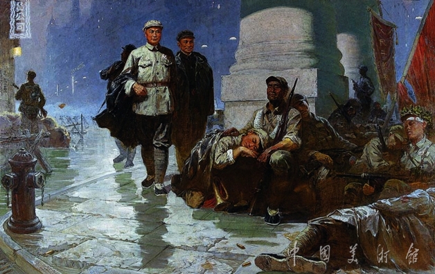 作品简介:油画作品《拂晓》艺术地再现了1949年5月27日上海解放那天,经过一天巷战的士兵们带着满身疲倦露宿在南京路街头的情景。画面特别选取了拂晓时分陈毅司令和粟裕将军巡视正在休息的解放军官兵的一幕。画作《拂晓》是肖峰、宋韧根据自己亲身经历自发创作的一幅油画作品。肖峰、宋任夫妇是在革命激流中成长起来的艺术伉俪。在从艺60余年中,他们风雨同舟,一起创作了不少革命历史油画。为了找到油画中人物的准确造型,肖峰亲自当模特,拍下不同角度的照片作为创作参考。
